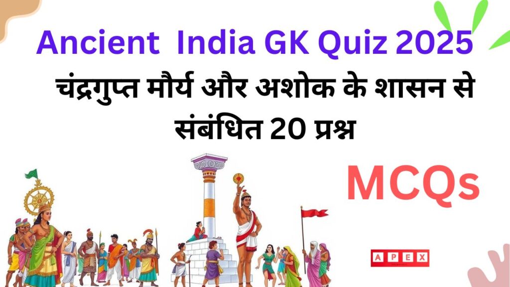 नमस्कार दोस्तों! 😊 आपका हमारे इस लेख में हार्दिक स्वागत है। आज हम आपके लिए प्राचीन भारत से जुड़े 25 महत्वपूर्ण सामान्य ज्ञान प्रश्न लेकर आए हैं, जो प्रतियोगी परीक्षाओं की दृष्टि से बेहद उपयोगी हैं। ये प्रश्न विभिन्न सरकारी परीक्षाओं जैसे UPSC, SSC, रेलवे, बैंकिंग, पुलिस, आदि में अक्सर पूछे जाते हैं। आइए, बिना … Continue reading 20 Key Questions on Chandragupta & Ashoka’s Rule – Test Your Knowledge!